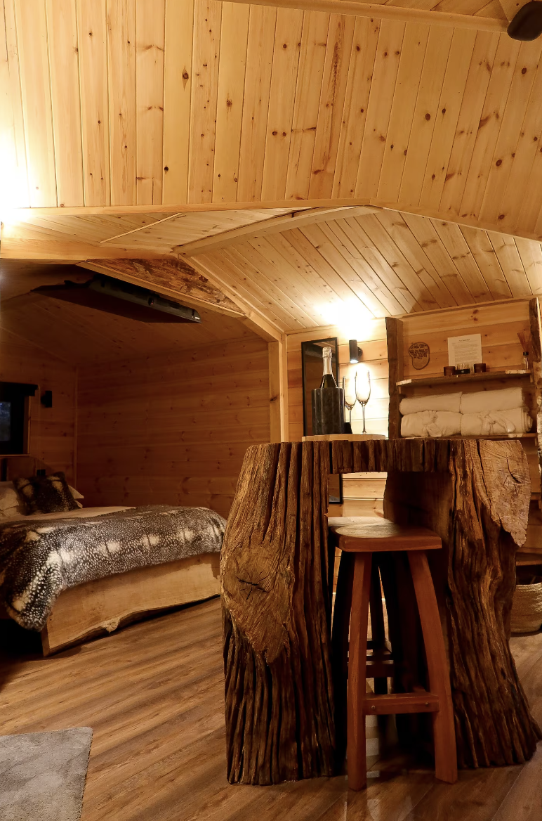 From the moment you arrive, the treehouse invites a slower rhythm. Morning light filters gently through the branches, casting soft patterns across the space as you wake to birdsong and the scent of the woods. Evenings unfold in a warm hush — sharing a quiet meal on the deck, lingering over a glass of wine, or simply watching the sky fade into dusky purples. Here, time stretches sweetly. Conversations run deeper, laughter feels lighter, and every moment together becomes its own little memory. It’s a place where romance isn’t planned — it happens naturally.